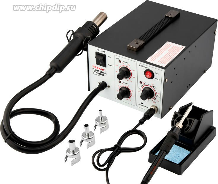 Комплектация станции: основной блок, термофен, паяльник, держатель паяльника, держатель термофена, губка для очистки жала паяльника (в ложементе), 3 насадки для термофена разного размера.