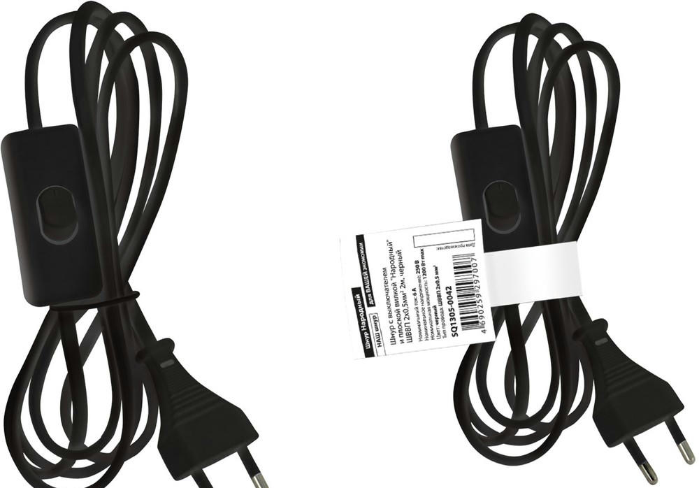 Шнур с выключателем и плоской вилкой «Народный» ШВВП 2х0,5мм2 2м. черный